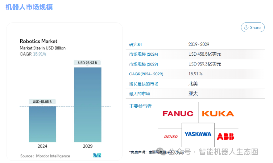 2024年机器人市场规模预计为458.5亿美元,预计到2029年将达到959.3亿美元,在预测期内(2024-2029年)复合年增长率为15.91%。