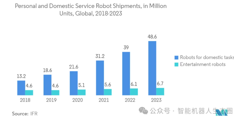 人口老龄化是机器人在家庭医疗保健和援助应用中部署大幅增加的主要驱动力之一。例如,根据联合国的数据,全球65岁以上人口预计将增长181%,到2050年可能占总人口的16%。