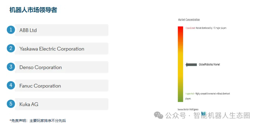 全球机器人市场相对分散,主要市场参与者包括ABB Ltd.、Yaskawa Electric Corporation、Denso Corporation、Fanuc Corporation 和 Kuka AG。市场供应商正致力于扩大海外客户群。两家公司正在利用战略合作举措来提高市场份额和盈利能力。